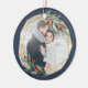 Elegant photo Christmas ornament features a favorite photo encircled by a faux gold foil geometric frame with green watercolor foliage and red berries. Add your names and the year, or a custom message, to the reverse side in a matching frame.