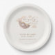 Cute sleepy cub bear sleep on the moon theme, design with beige, brown cream, tan colour scheme. baby shower featuring watercolor illustration of a cub with boho moon, cloud, star. The text says "we can bearly wait!" This paper plate is great for a gender neutral shower in the winter, spring, fall and summer.