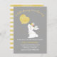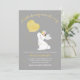 Looking for a sweet bunny baby shower invitation? This design features a faux gold calligraphy heading, a bunny and yellow watercolor balloon. The background is gray and the back of the invitation is an off white and yellow watercolor striped pattern. The faux gold calligraphy heading can't be altered but all other text is editable. This bunny baby shower invitation is ready to be personalized.