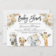 Sweet and gender neutral safari animals baby shower invitation featuring four jungle animals and some white, green and brown boho floral arrangements as well as a modern calligraphy heading image that is removable. This safari baby shower invitation is a sweet way to invite guests to a safari themed baby shower.