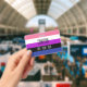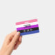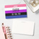 The background is the pride flag for genderfluid people. This is a striped pattern of pink, white, purple, black and blue. There is space for a custom name and pronouns.