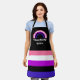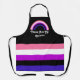 Medium-sized apron with an image of a genderfluidity pride flag and a rainbow; pink, white, magenta, black, and purple design on a black background, with a customizable text template for your own name or message