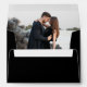 Modern black wedding envelope featuring a minimal design with your names and return address in a combination of simple sans serif fonts and an elegant script. Inside is your favourite photo (if you prefer, you may remove the photo in the design editing tool). This chic envelope would be great for a goth themed or Halloween wedding.