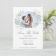 Our gentle botanical collection features light green, teal and gold gentle watercolor foliage paired with golden frames and teal background for a perfectly elegant wedding collection. You can find matching items for your complete wedding experience but also crafts, gifts and some personal items. We believe that you are going to enjoy it to the fullest as it is a collection for every season. This save the date card features your own photo in a blue foliage wreath with all information in elegant script for you to customize