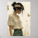 A young woman with dark, wavy hair stands in a dreamy, pastel-coloured background. Her romantic outfit, featuring a cream-coloured blouse and a floral headpiece, gives her a natural and delicate aura. Golden butterflies flutter around her, enhancing the atmosphere of lightness and harmony. The soft tones and intricate details create a poetic and serene mood.