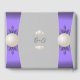 Collect all of your wedding guests signatures in style with this beautiful custom keepsake guestbook. This book features a pristine pearl and lavender purple ribbon design on a timeless silver grey background. Although this guestbook would be a wonderful touch to any season, the gentle lavender and grey colours and shiny pearl would beautifully fit a spring wedding. The names of the bride and groom, as well as their wedding date, can be elegantly displayed on the front of the book. Be sure to include monograms of the bride and groom on the back of the book as well. Finally, you can add a custom title to the spin of the guestbook.