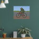 A dark green frog wearing a tan plaid ivy cap (or driving cap) and a satisfied smile pedals along on a red bicycle on a dirt road by a moss-covered grey stone wall in the mixed media image on this poster print. With deep blue skies above, it looks like he has a beautiful day for cycling! From my original digitally created image.