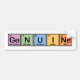 This funny design shows the word GENUINE in elements of the periodic table. THe symbols spell out: Germanium + Nitrogen + Uranium + Iodine + Neon = GeNUINe