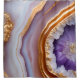 The pair of curtains feature a striking design resembling a geode or agate stone cross-section, with layers of lavender, light blue, white, and gold on the outer edges, transitioning to deeper purple and brown hues towards the centre. The central focal point is a vibrant purple and white crystalline structure, surrounded by a golden border. The overall effect is visually captivating, giving the impression of a natural mineral formation.
