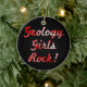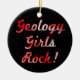 This hanging ornament features the phrase "Geology Girls Rock!" Because they do! The font is red with a cloudy pattern applied.