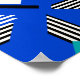 This artwork features a striking geometric composition built on a deep blue background, accented by bold teal diamond shapes placed symmetrically across the design. Black and white striped lines intersect diagonally, creating sharp angles and a strong sense of movement. The combination of blue, teal, black, and white forms a modern, energetic visual style that highlights contrast, rhythm, and balance within the abstract layout.
