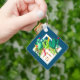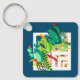 Succulent and cactus garden themed square keychain featuring a colourful geometric terrarium of cactus, succulents, and gravel. The background is a dark faded navy blue colour.