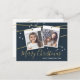 Deluxe navy blue Christmas Holiday Postcard design with two personal photos hanging in white photo frames on geometric golden tape lines surrounded by little white stars. On the back of the dark blue Christmas postcard the golden geometric lines are in the corner along with little golden stars and a warm Christmas wish and your family names. A luxurious photo Christmas design by Luckz.