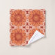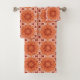 Towel set in a geometric daisy pattern in mandarin orange, pastel orange.and deep rust red