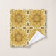Towel set in a geometric daisy pattern in mustard gold, beige and chocolate brown