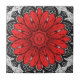 Ceramic tile in a geometric daisy pattern in deep red / crimson on a black and white patterned background