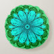 Round pillow in a geometric daisy pattern in turquoise and dark and light emerald green