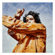 A captivating portrait featuring a woman with curly hair, partially concealed by an orange jacket, set against a backdrop of a crisp blue sky. The image stands out with a unique geometric, polygonal style, lending an abstract and digital art feel to the scene. Her pose is dynamic and expressive, creating a sense of motion and energy. The contrast between the warm orange tones of her jacket and the cool blues of the sky adds depth to the composition, merging fashion with a modern artistic touch. Ideal for those seeking visually striking, contemporary portrait photography with an abstract edge.