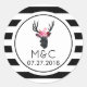 Wedding stickers with the couples initials and wedding date. Designed with a black deer head made with geometric lines and wearing a pink floral crown. Rustic and trendy design. Background is a pattern with black and white stripes.. Personalize with your initials and wedding date.