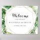This geometric destination green wedding welcome sign is perfect for a tropical wedding. The design features hand-painted watercolor green palm and banana leaves neatly arranged into beautiful bouquets, adorning a gold geometric frame.