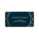 A modern wedding address label, features a "faux foil" gold rose geometric pattern over a dark turquoise background. All your details are spelled in a beautiful modern typo.