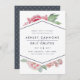 Elegant save the date cards feature a chic mix of vintage watercolor florals and modern geometric elements. A spray of blush pink watercolor peony flowers peeks out from the top and bottom of a central diamond shaped element outlined in midnight blue, holding your names and wedding details in clean, modern lettering. Cards reverse to a subtle dotted diamond pattern in white on a dusty blue grey background.