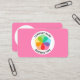 A business card template with a geometric abstract motif made up of five overlapping semi-transparent elliptical shapes in five different colours arranged around a centre point, creating a pentagon with a geometric flower like shape in the centre. The symbol is placed in a white circle with curved text company name and business type. Name and other contact details on the reverse using the white circle panel without the symbol with the name and job title placed inside and arranged to the left side.