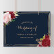 Cette affiche géométrique en or et rouge tropical de mariage d'accueil est parfaite pour un mariage rustique. Le design artistique bordo marsala présente des roses d'aquarelle, verts, roses, bordeaux et roux assortis de verdure soigneusement disposés autour de cadres d'or géométriques dans un bouquet de fleurs gracieux et radieux. Faites de cette affiche votre propre par le nom de la mariée et du marié, et la date du mariage.