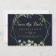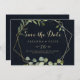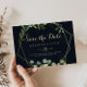 This geometric gold blue green horizontal wedding save the date is perfect for a modern wedding. The design features hand-painted beautiful green leaves in a dark blue background, adorning a gold geometric frame.