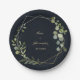 These geometric gold blue green wedding paper plates are perfect for a simple wedding. The design features hand-painted beautiful green leaves in a dark blue background, adorning a gold geometric frame.