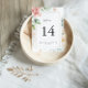 This geometric gold green foliage floral wedding table number is perfect for a modern wedding. The design features hand-painted botanical green and gold foliage with pink, blush, white flowers, adorning an elegant geometric frame.