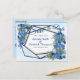 Geometric gold-navy frames with blue corn-flowers, white roses & arum-lilies, blue spring flowers with a light blue textured paper background for a spring or summer stationary card