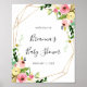 This geometric gold tropical fall baby shower welcome poster is perfect for a modern baby shower. The design features pink, blush, yellow, blue and white watercolor fall peonies with botanical green leaves, adorning a geometric frame.