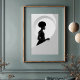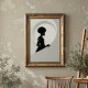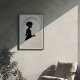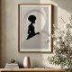 Make a striking statement with this captivating black and white art print, a masterful display of avant-garde fashion and artistic composition. This elegant profile portrait features a woman of profound grace, adorned in a sophisticated black ensemble including a large, flat-brimmed circular hat, a tailored dress with a defined waist, and sleek long gloves. Her dark skin tone creates a powerful contrast against the pristine white background, which is dramatically framed by a curving, concentric white architectural element. Her pensive gaze and poised hands resting on a white surface add to the artwork's enigmatic allure, emphasizing the interplay of light, shadow, and minimalist forms. Perfect for modern living spaces, fashion studios, or any decor seeking a touch of unique elegance, bold artistry, and a truly unforgettable visual narrative.