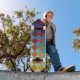 Geometric pattern of colourful chess style squares with gradient effect and warm and cool colours.