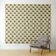 Geometric pattern with overlapping half-circles in teal, cream, brown, and peach on an orange background, creating a vibrant and retro feel.