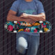 This skateboard deck features a vibrant mix of geometric pop-art shapes with the empowering mottos "Ride Fast" and "Live Free." Perfect for skaters who value speed and freedom, this high-energy design blends bold colours with an urban art style to make a statement.