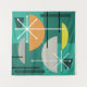 A retro abstract art design with symmetrical and asymmetrical geometric bowl shapes and lines. Teal turquoise, orange, yellow and grey.
