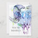 All occasion party invites easy to read for you to personalize. These feature an artistic ram skull drawing with geometric touches here and there and watercolor splashes and drips in the colours of blue purple and yellow on white on one side.