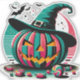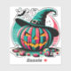 A playful retro pumpkin wearing a witch hat, illustrated in a mid-century modern style with bold geometric shapes and a pastel-retro color palette of teal, pink, orange, and black.