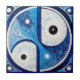 A crisp looking bohemian-inspired illustration with blue and white yin yang stylized symbols amidst a geometric pattern, evoking a sense of spiritual balance and harmony.