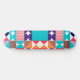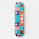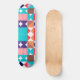 Abstract geometric skateboard in blue, turquoise, red, black, and orange colours.