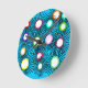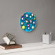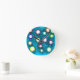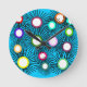 This clock has a geometric design of circles of different colors with lines coming out on a field of blue.