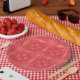 A pattern of geometric shapes made up of diamonds and triangles. Red and pink tones create a cheerful design.