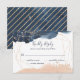 Geometric wedding RSVP in navy, gold, and blush. You details are framed in a gold geometric shape with a splash of watercolor in navy on the top and blush on the bottom. Gold flecks of dust decorate the top and bottom of the card. The back of the card is designed with gold stripes in a diagonal pattern over a navy blue watercolor background. You can add or change the RSVP details on the card. If you need to make more changes, you can click on the customize link/button and change things like font size, font style, font colour, etc.