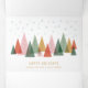 A minimalist design showcasing a colourful forest of stylized, geometric trees under falling snowflakes. The bright colours and modern shapes create a joyful and festive holiday atmosphere.