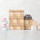Geometric wooden panels are arranged against a textured sand backdrop, creating a visually interesting contrast between the smooth wood grain and the fine sand