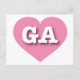 This postcard features a vibrant pink heart containing the bold, white, upper case letters GA, the official abbreviation for Georgia, the peach state. The reverse side of the postcard is blank, awaiting your handwritten sentiments or customized text.