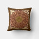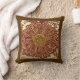 Throw pillow in a block print of a Gerbera daisy, based on a photograph, digitally transformed and hand tinted - shades of camel tan, chocolate brown and warm beige, with a deep chocolate brown border