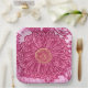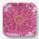 Paper plate in a block print of a Gerbera daisy, based on a photograph, digitally transformed and hand tinted - shades of fuchsia pink with deep maroon / burgundy and shell pink